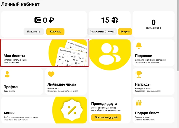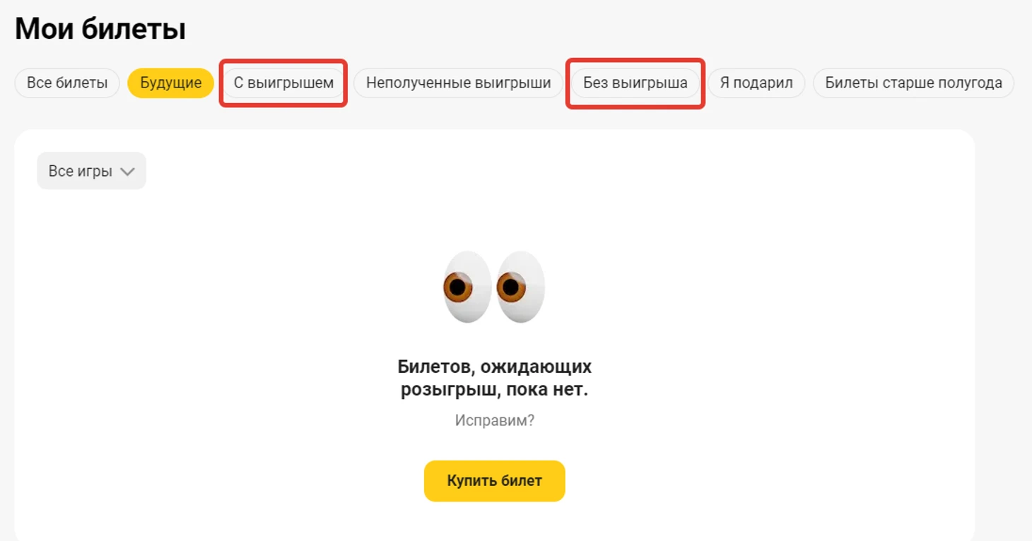 В категории «Билеты» хранится информация обо всех купленных купонах. Из всех разделов обратите внимание на «С выигрышем» и «Без выигрыша».