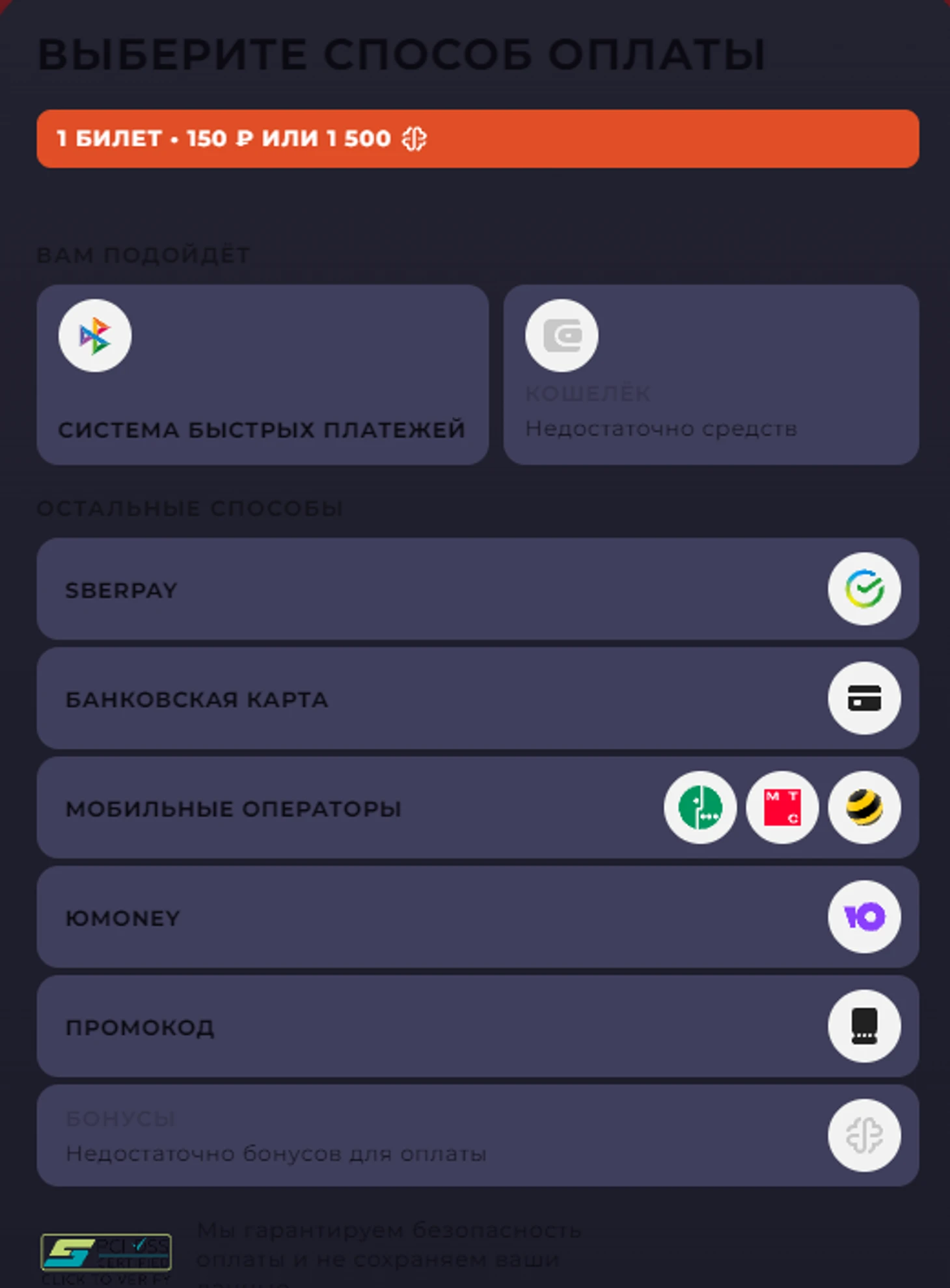Для оплаты билеты игрок может выбрать банковские карты, ЮMoney, СБП, SberPay, мобильные операторы и баланс внутреннего кошелька «Столото».