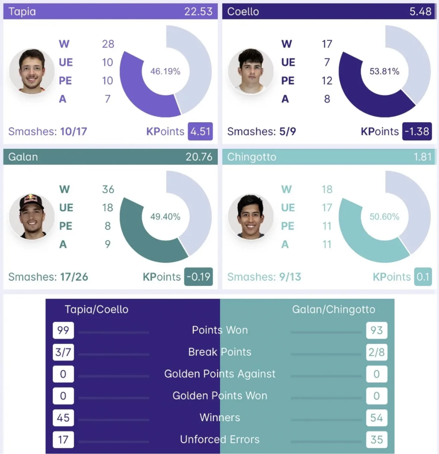 Тапия и Коэльо выиграли 99 мячей, Чинготто и Галан – 93, причем у проигравшей пары больше активно выигранных мячей – 54 против 45.
