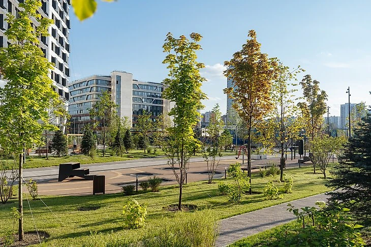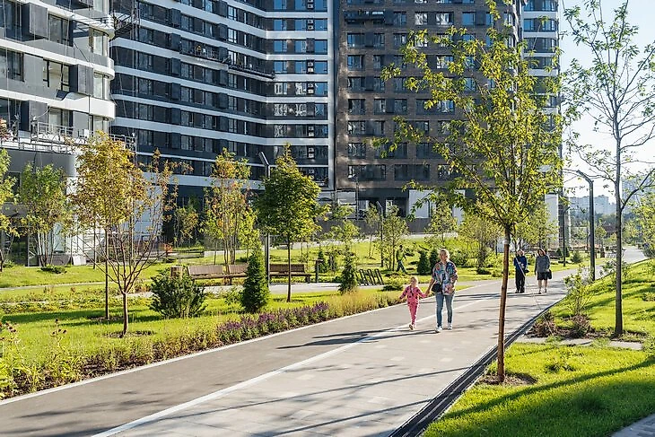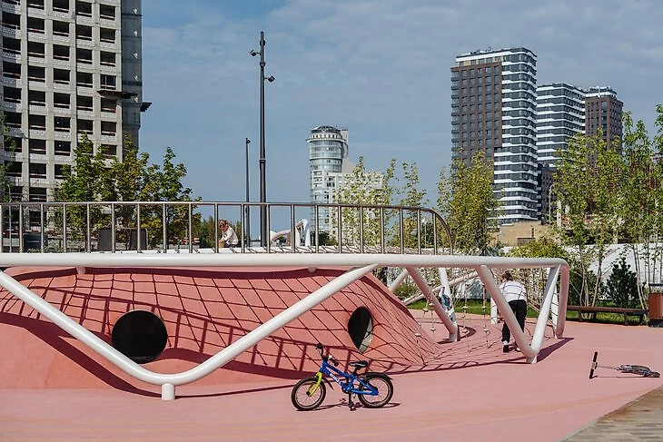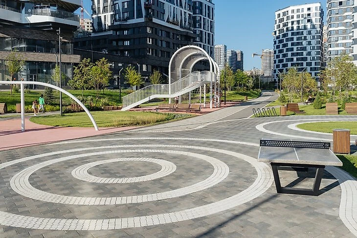 Чтобы утренняя или вечерняя пробежка приносила пользу не только физическому, но и ментальному здоровью (снижению стресса и улучшению настроения), все 6 кварталов пересекает двухкилометровая «Зеленая река» – ландшафтный парк с уютным бульваром. В центре комплекса находится двухуровневый мост с горшками для рябины и вьющимся виноградом вместо опор. Под ним в специальном крытом пространстве установят качели, а в непогоду здесь будут проходить спектакли и концерты.