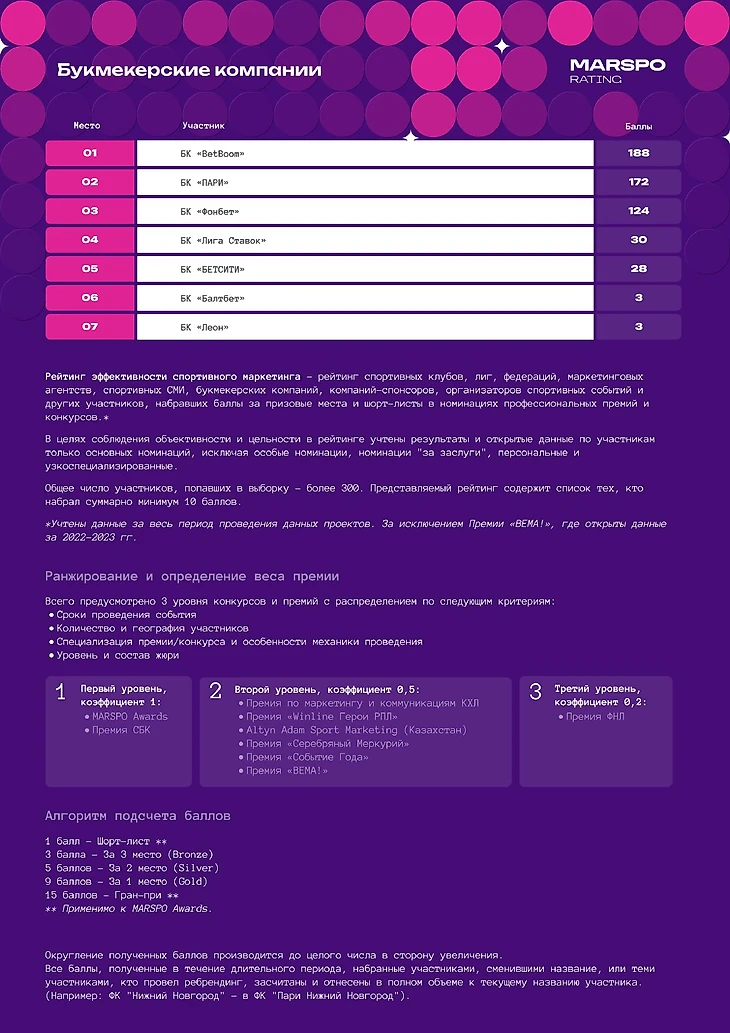 Для получения максимально широкой картины в рейтинге приведены данные по участникам и победителям: премии Marspo Awards, Премии СБК, премии по маркетингу и коммуникациям КХЛ, премии «Winline Герои РПЛ», премии ФНЛ, премии «Серебряный Меркурий», «Событие Года», премия «BEMA!» и премии «Аltyn Аdam Sport Marketing» в Казахстане (данные учтены за весь период проведения данных проектов).