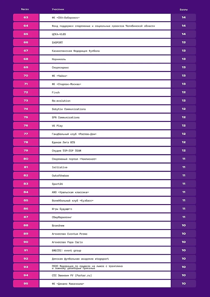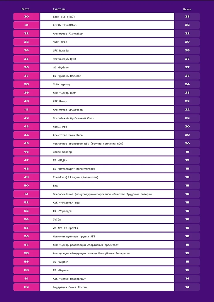 Стал известен Рейтинг эффективности спортивного маркетинга. Общее число участников, попавших в выборку – более 300