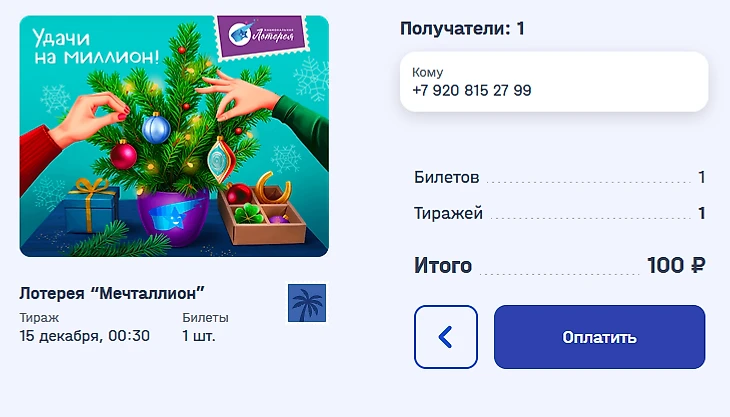 Стоимость одного лотерейного билета 100 рублей вне зависимости от варианта его приобретения.