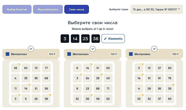 • свои числа — выбор любых четырех чисел, которые должны быть в лотерейном купоне.