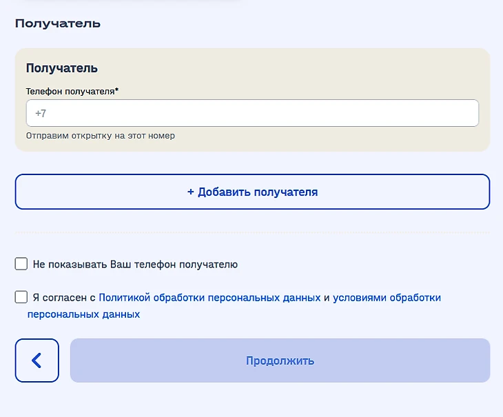 Ввод номера телефона получателя и переход к подтверждению покупки