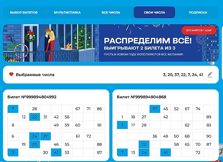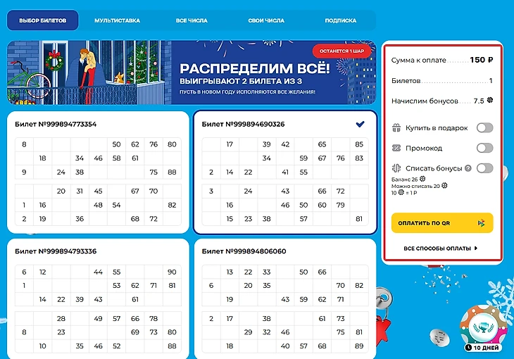 • мультиставка — покупка от 1 до 300 билетов со случайной комбинацией;