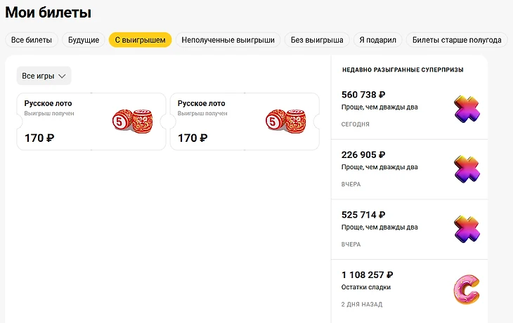 • с выигрышем — указаны все билеты, которые оказались с правильной комбинацией;