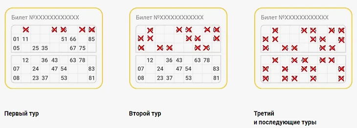 • в первом туре выигрывают те, кто раньше остальных закрыл любую горизонтальную строку из пяти чисел;