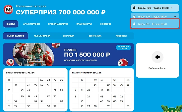После авторизации на сайте «Столото» потребуется выбрать «Жилищную лотерею». Это можно сделать в общем списке лотерей или нажать на логотип «Жилищной лотереи» на главной странице. Перейдя к странице с лотерейными билетами надо сменить текущий тираж на 631 —, он пройдет 1 января 2025 года.