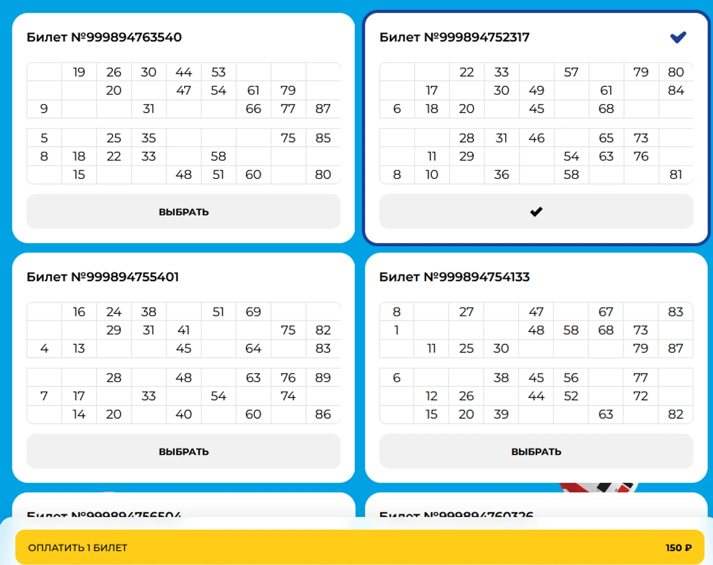 При переходе на страницу с «Жилищной лотереей» покупатель увидит список лотерейных билетов. В каждом купоне по 30 неповторяющихся чисел в диапазоне от 1 до 90, разделенные на два поля по 17 чисел. Вы можете выбрать любой из представленных, но если вас не устраивает комбинация, то можете обновить список, нажав «Другие билеты».