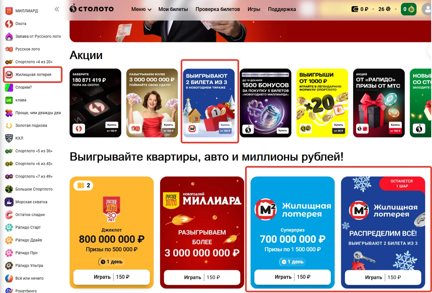 Есть несколько способов перейти к выбору лотерейных билетов. «Жилищную лотерею» можно выбрать из общего списка или на главной странице нажать на название игры в разделе «Акции» или в подборке лотерей.