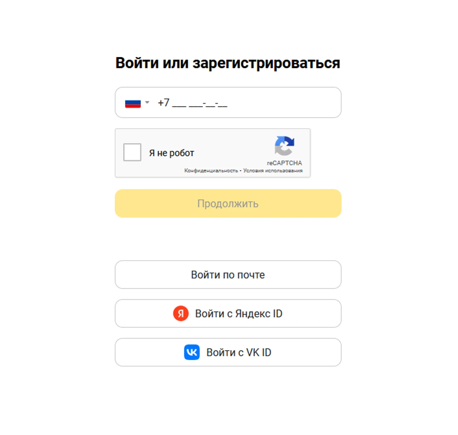 Вы можете войти на сайт по номеру телефона и коду, который получите в СМС-сообщении. Есть дополнительные способы регистрации на портале. Вы можете выбрать электронную почту или профили в «Яндекс ID» и «VK ID».