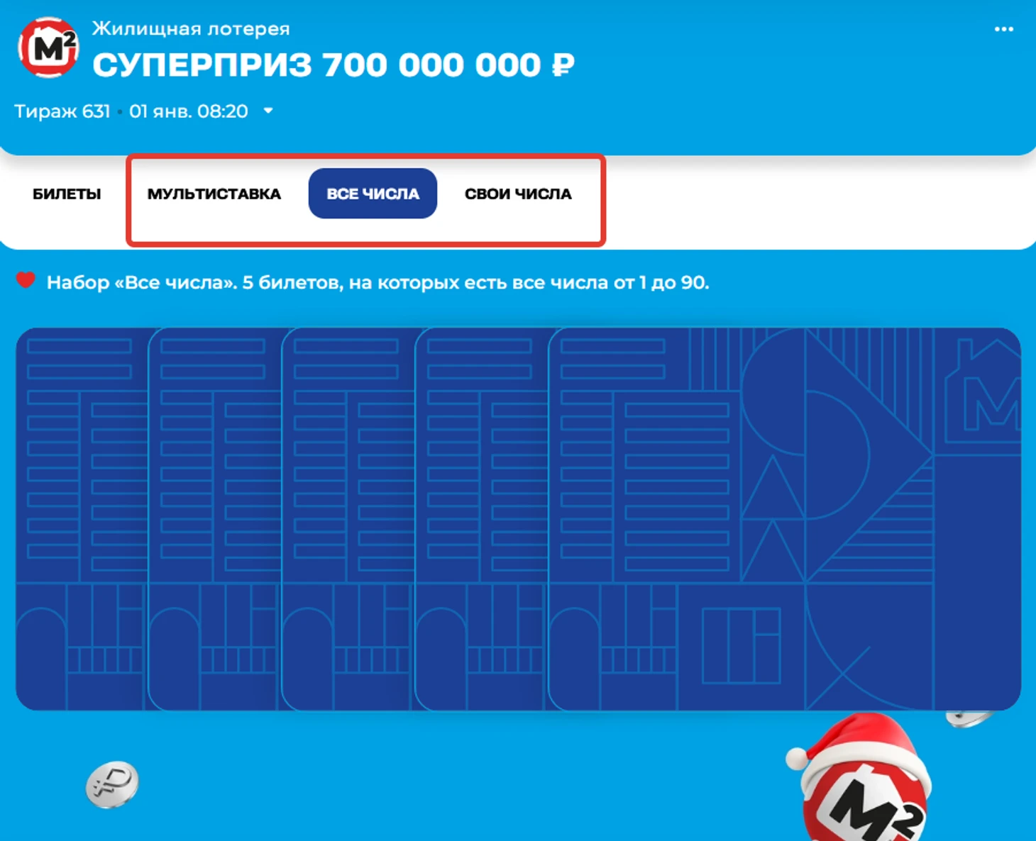 все числа — покупка 5 билетов за 750 рублей, в которых есть все числа от 1 до 90;