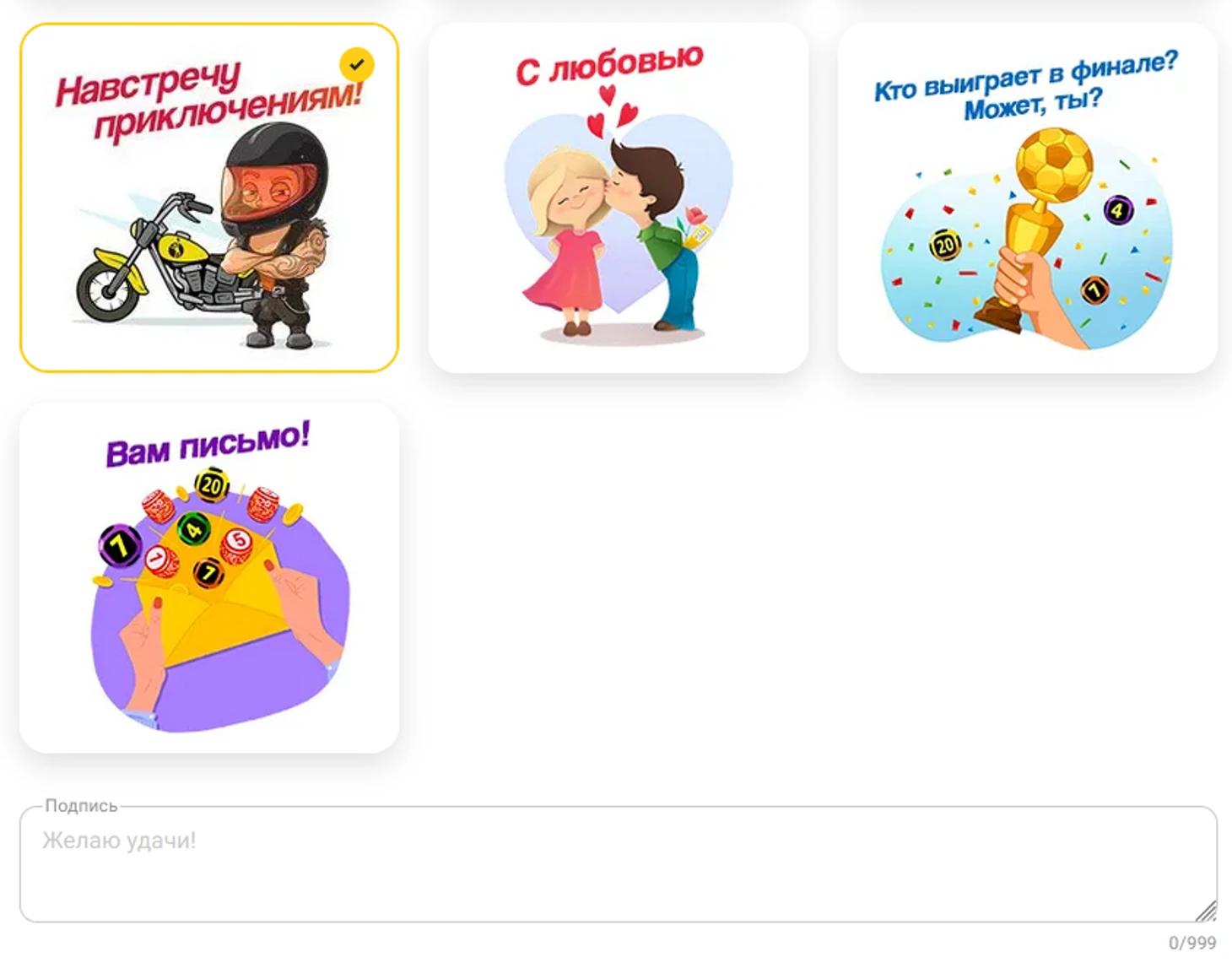 На следующем этапе надо выбрать поздравительную открытку. На момент выхода руководства, на «Столото» не представлены новогодние. Помимо открытки вы можете добавить подпись, написав поздравление или что-то другое. Определившись с открыткой и текстом надо нажать «Далее».