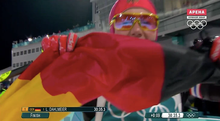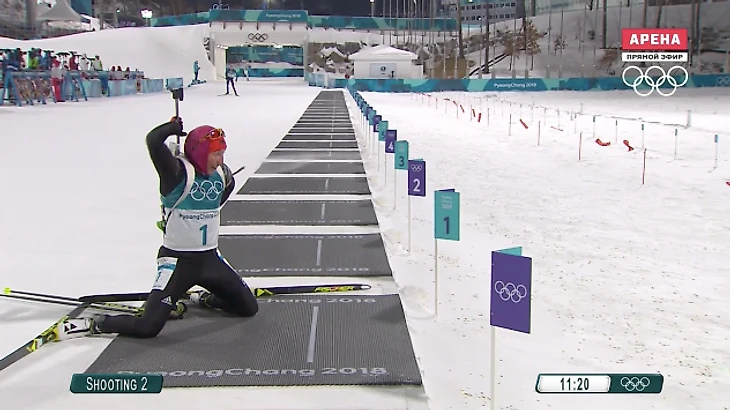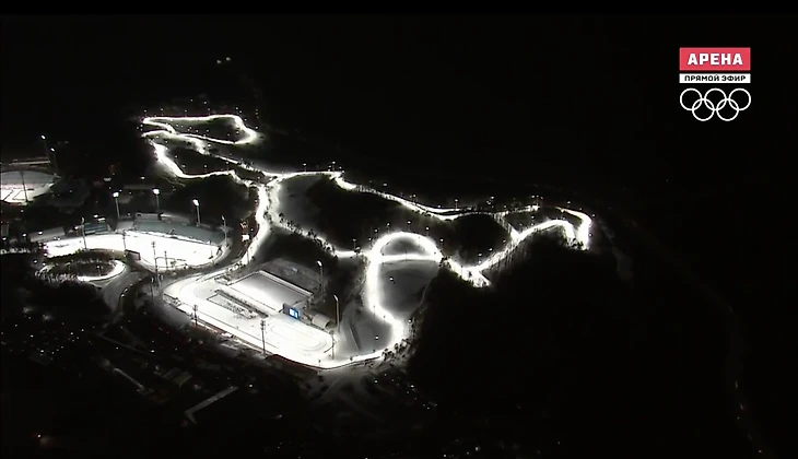 13:00. В Пхенчхане темно и красиво. Это биатлонный стадион, где сейчас уходит на старт Лаура Дальмайер.