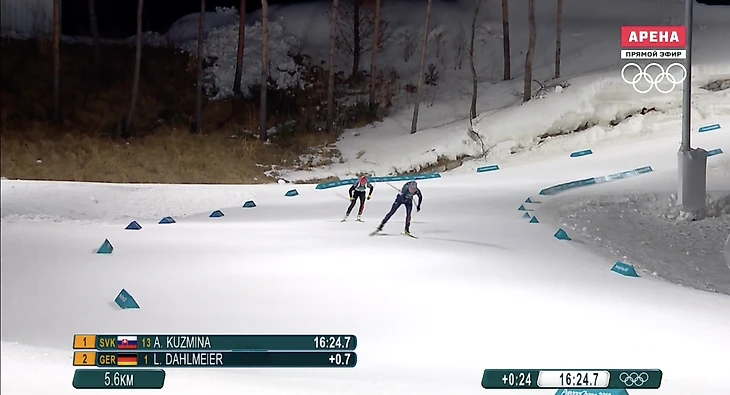 13:33. Анастасия Кузьмина провалила третью стрельбу, и Дальмайер снова впереди с 40-секундным отрывом.