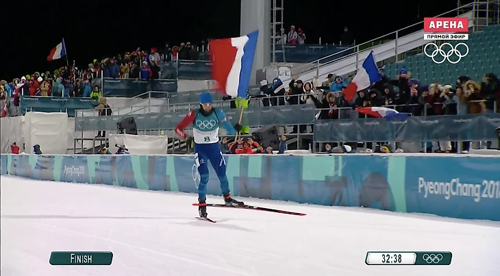 15:33. Мартен Фуркад – олимпийский чемпион. Швед Самуэльсон второй, Бенедикт Долль из Германии третий. Антон Бабиков финиширует минуты через три.