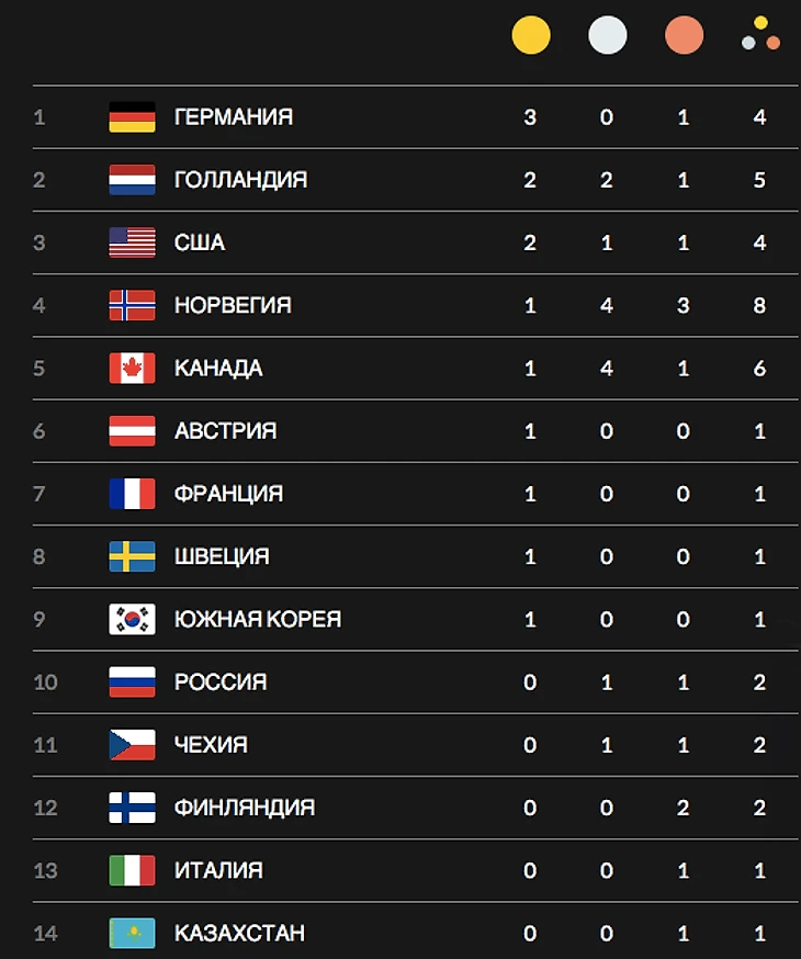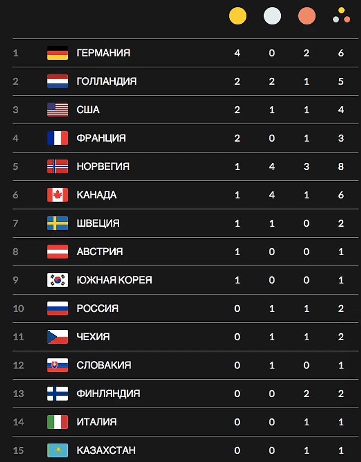 15:59. Немцы лидеры общего медального зачета, у России две медали и десятое место. Не исключено, что Голландия и США обновят свои показатели – в Корее уже почти ночь, но соревнования по фристайлу, конькобежному спорту и прыжках с трамплина.
