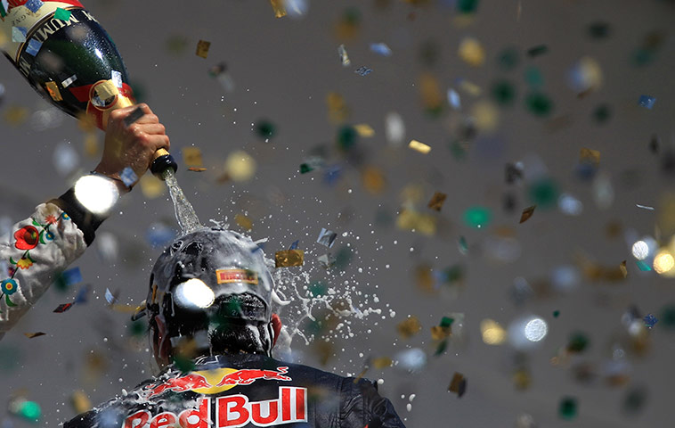 Шампанское для Марка Уэббера на подиуме бразильского Гран-при.