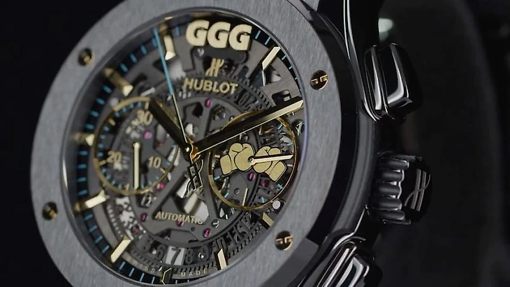 • Это часы Hublot. Мой дизайн, специальная линейка. Пару месяцев мы разрабатывали дизайн — буквы GGG, боксерские перчатки. Желто-голубая прострочка – цвета казахстанского флага, как напоминание о моей родной стране. Не слишком кричащие, совсем немного золота. Не очень тяжелые и не очень большие. Частичка моей истории.