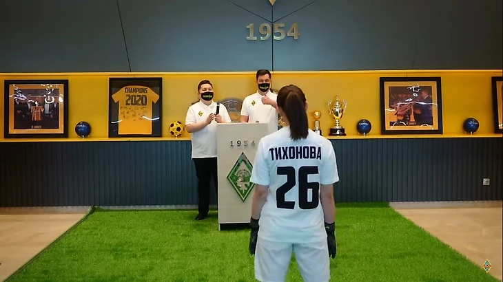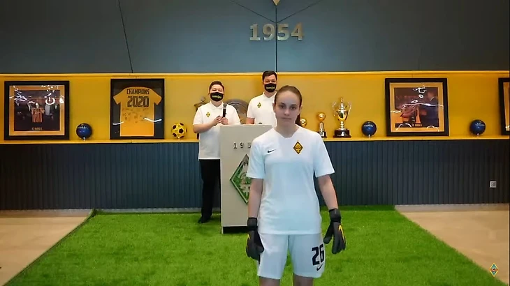 В прошлом году у клуба появилась женская команда. Ее вратарь также показалась в экипировке.
