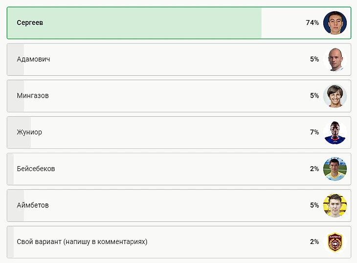 У нас было 6 номинантов. Ожидаемо лучшим стал выстрел Игоря Сергеева из «Актобе» в ворота «Ордабасы». Форвард сборной Узбекистана забил со своей половины поля. Этот мяч набрал 74% – определенно он в числе главных претендентов на гол сезона.