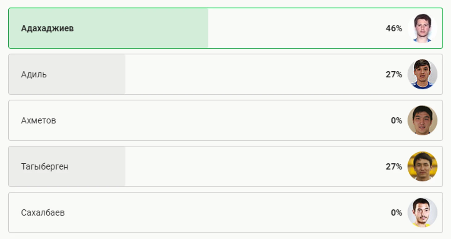 В этот раз у нас было 5 номинантов – и все в исполнении казахстанцев. Больше всего голосов вы отдали за мастерски выполненный штрафной от Адама Адахаджиева из «Жетысу».