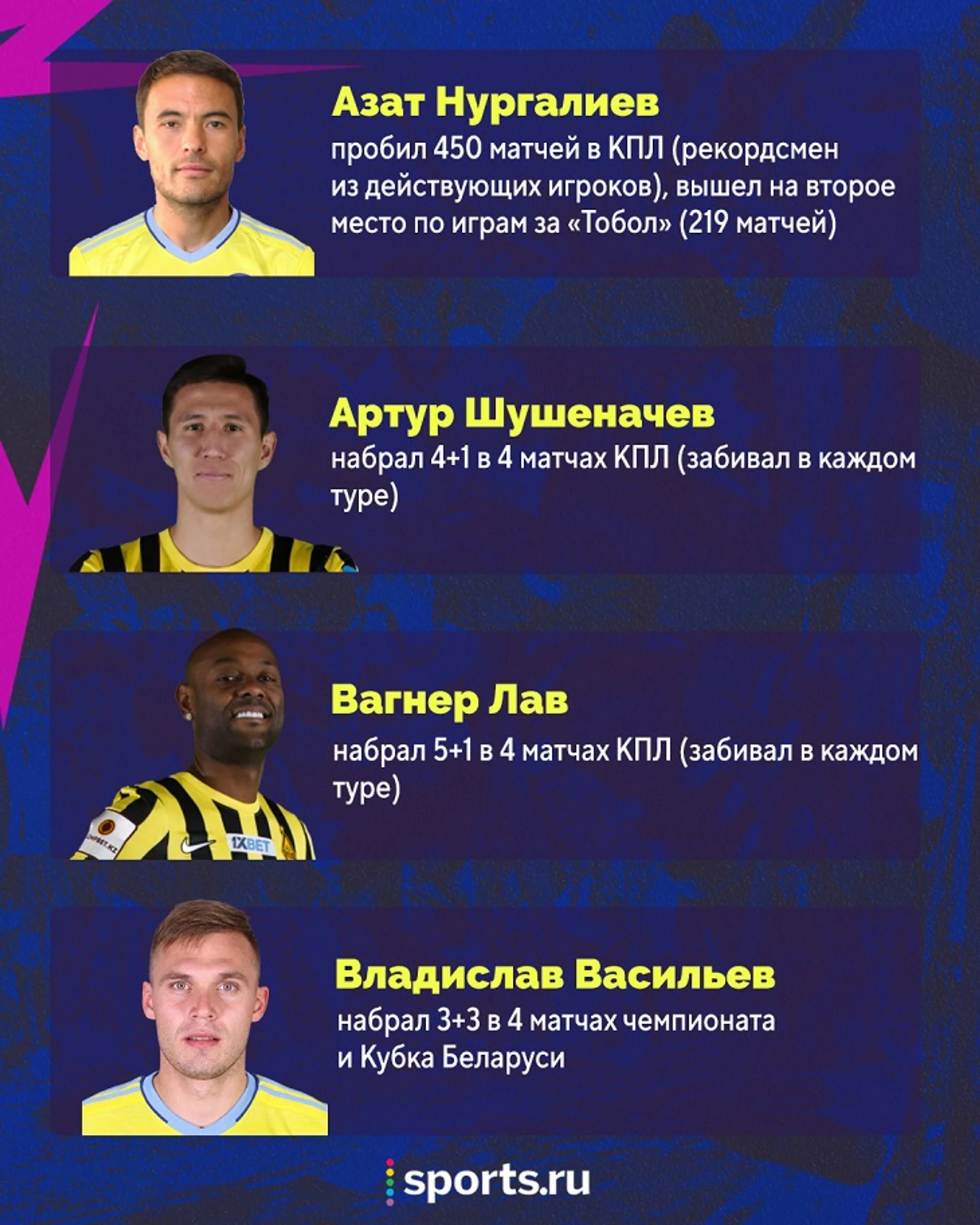 В 2021-м пользователи Sports.ru каждый месяц выбирают самого яркого спортсмена Казахстана. Лучшими уже признавались Юлия Путинцева, Кирилл Панюков, Александр Мокин, Жоао Пауло и Никита Бояркин.