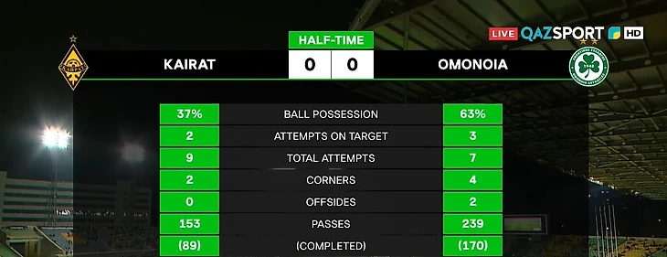 Статистика первого тайма. Алматинцам в перерыве предстоит серьезный разговор с Курбаном Бердыевым.