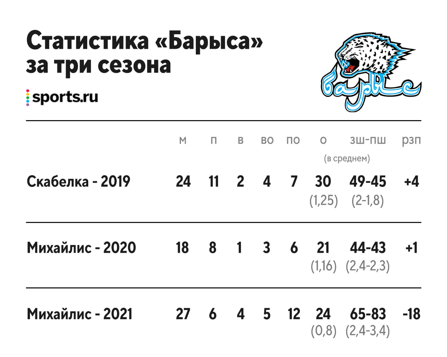 Команда Михайлиса в 2021-м статистически стала выглядеть невзрачно: астанчане, забивая 2,4 шайбы за матч, пропускают больше трех (3,4 шайбы). Клуб заработал 24 очка, а в среднем 0,8 очка за матч. Эти результаты хуже даже прошлогоднего результата Михайлиса (21 очко, 1,16 очка за матч), а в сравнении со временем Скабелки просто катастрофа: тогда «Барыс» зарабатывал 1,25 очка за матч (в целом 30 очков), а забивал больше, чем пропускал — 2 шайбы к 1,8.