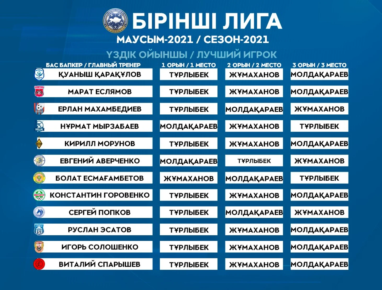 Барлық дауыстардың қосу нәтижесінде 2021 жылғы маусымдағы Бірінші лигасының үздік ойыншысы болып «Ақсу» командасының 20 жастағы шабуылшысы Мирас Тұрлыбек атанды.