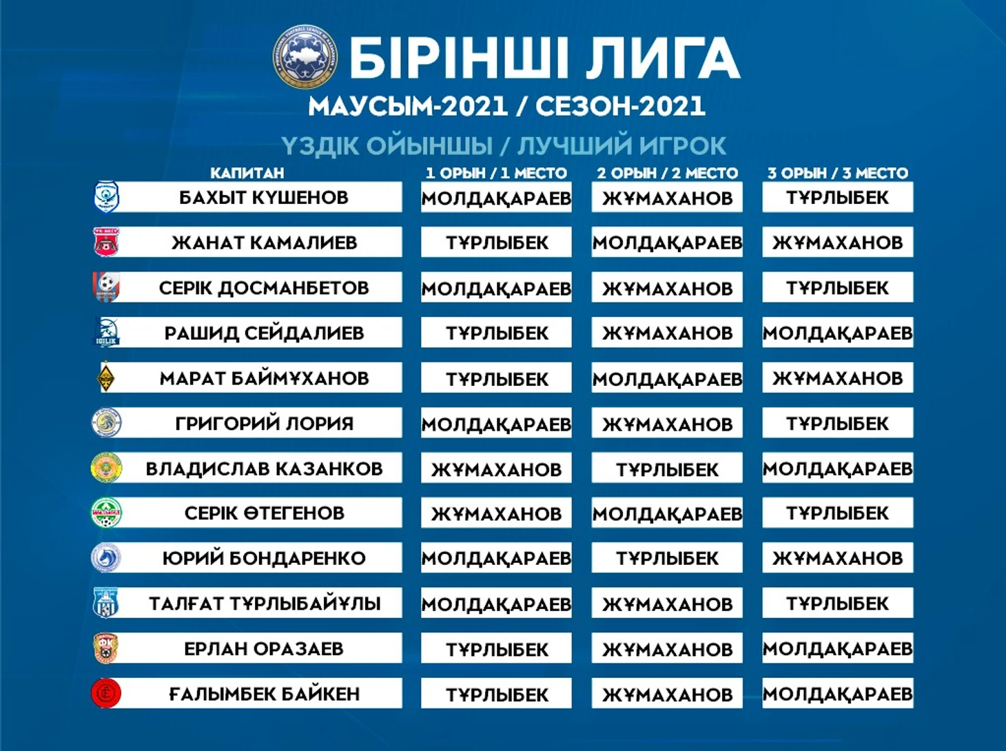 Қазақстанның кәсіпқой футбол лигасы 2021 жылғы маусым қорытындысы бойынша Бірінші лиганың үздік бас бапкері мен ойыншысын анықтау мақсатында сауалнама өткізді. Сауалнамаға лигаға қатысушы командалардың бас бапкерлері, капитандары және жетекшілері қатысты. Респонденттерге әр номинация бойынша маусымның үздік үш есімі ұсынылды.