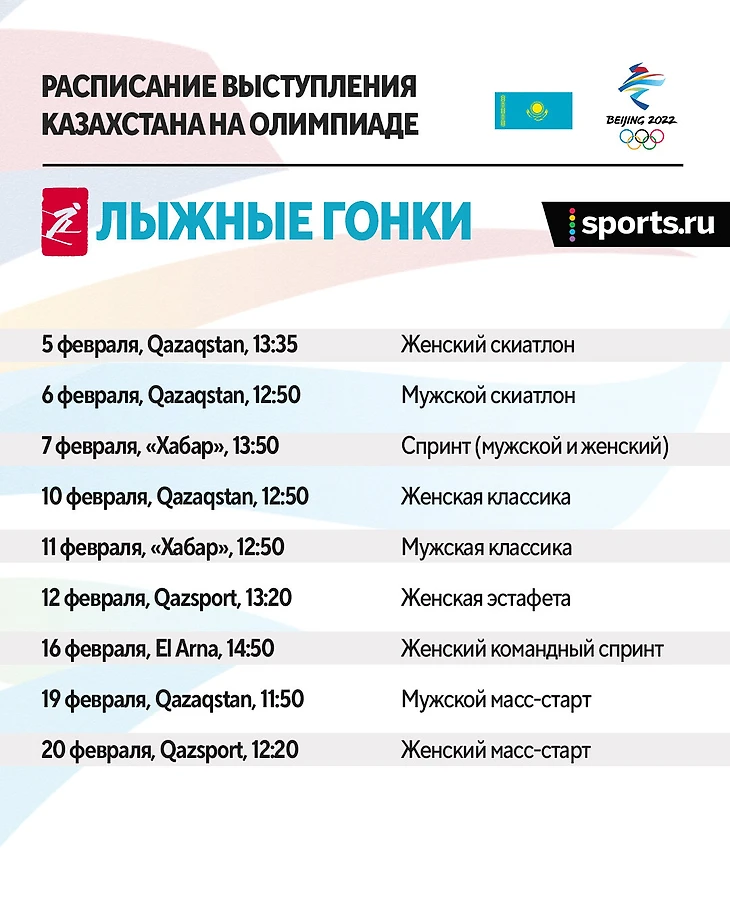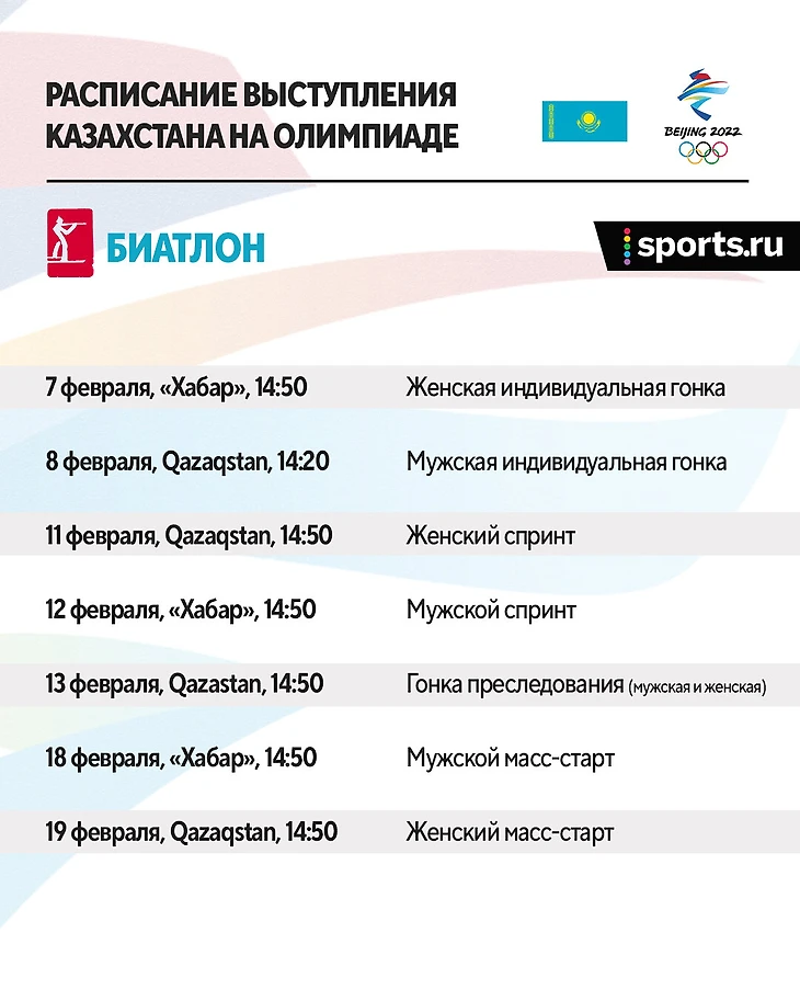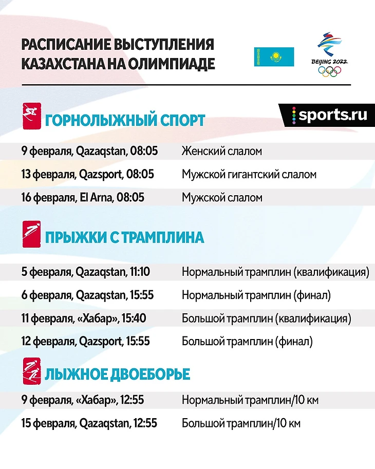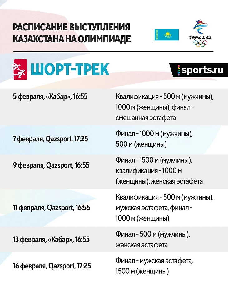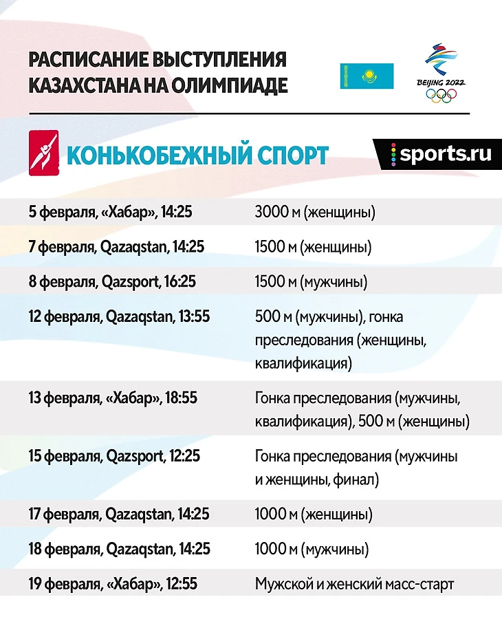 Это самое полное расписание выступлений казахстанских спортсменов. От нас требуется только одно: включить трансляцию и поболеть за наших.