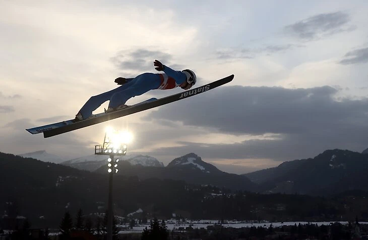 Казахстанские «летающие лыжники» Сергей Ткаченко и Данил Васильев поборются в состязаниях по прыжкам на лыжах с трамплина.