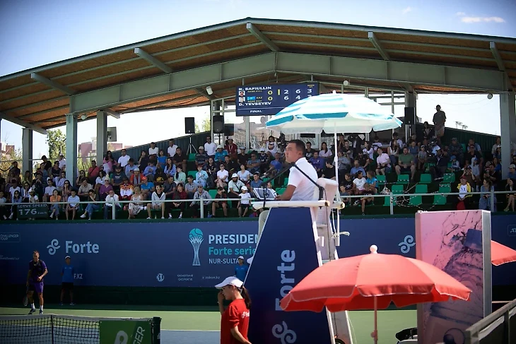 Последним матчем турнира стал мужской финал – казахстанец Денис Евсеев вышел на корт против Романа Сафиуллина. По рейтингу и прогнозам букмекеров местный теннисист был аутсайдером, но в первом сете так не показалось – 6:2.