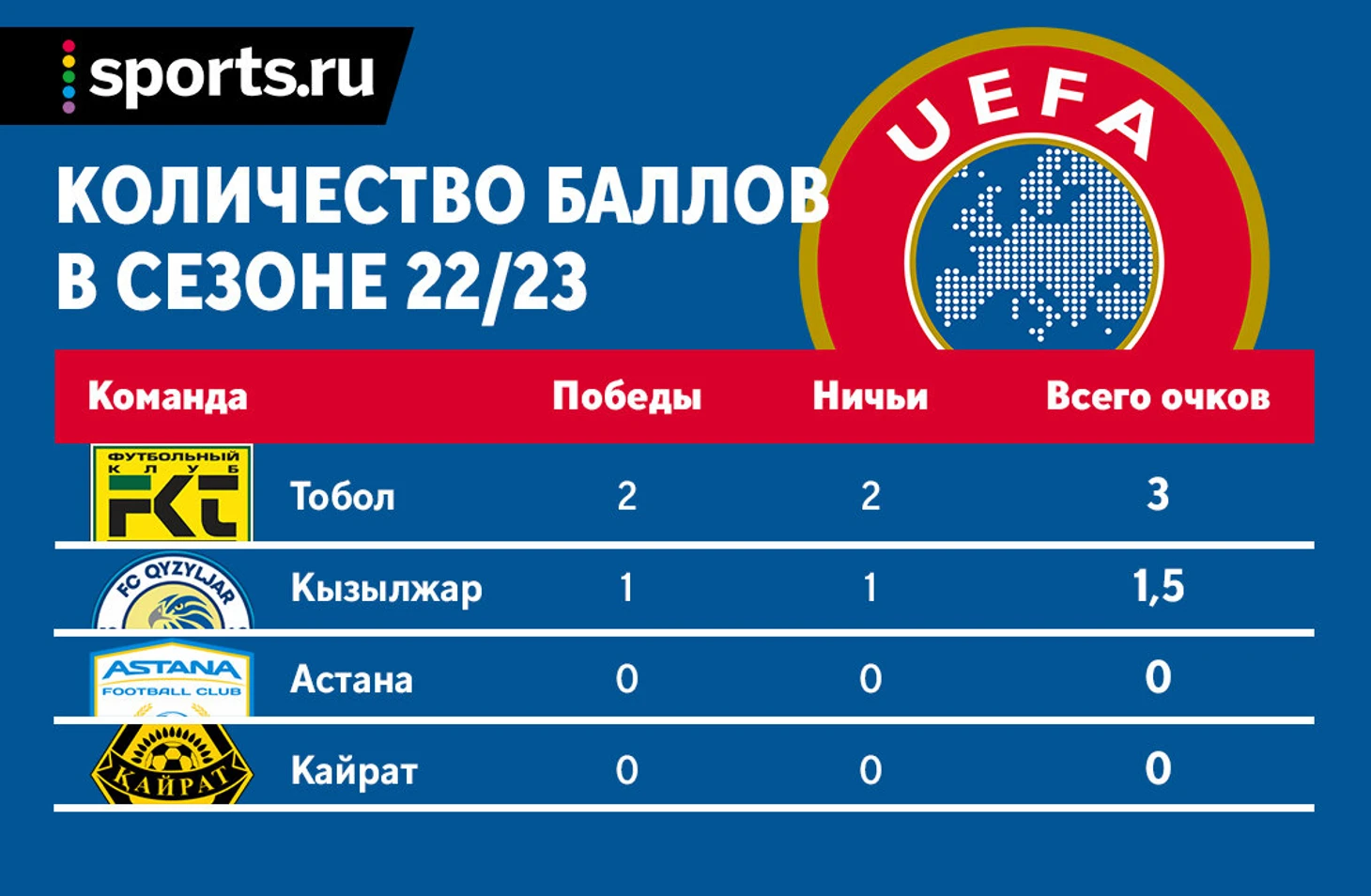 Прямо сейчас мы тридцатые, но уже в следующем году Казахстан лишится 4.250 баллов, заработанных в сезоне 18/19, и вылетит из тридцатки сильнейших ассоциаций.