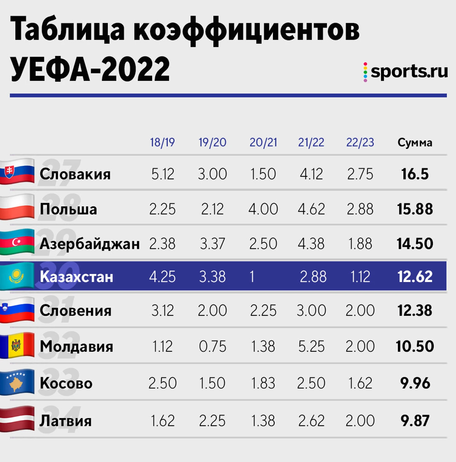 Уже точно Казахстан обгонят Словения, Молдова, Ирландия, Финляндия: клубы из этих стран продолжают участвовать в еврокубках, и имеют хороший запас баллов.