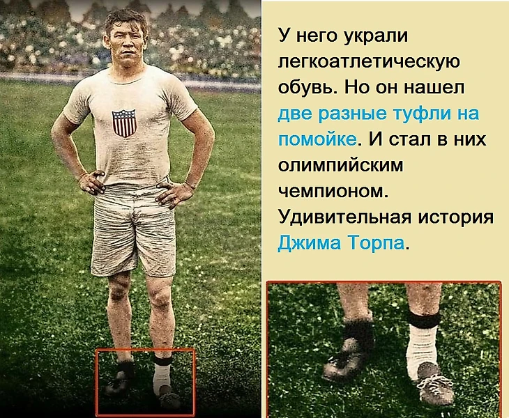 Как бы там ни было, перед вторым днем Торп остался без обуви. И если сейчас, 110 лет спустя, это кажется сущей мелочью, то в те славные времена найти запасную пару было сложной задачей. Торп со своим тренером оббежали всю команду США в надежде выпросить обувь на один день. Ведь команда большая, и далеко не у всех проходили соревнования в этот же день, да и запасная пара у более состоятельных ребят имелась. Но помогать краснокожему никто не хотел, и не важно, что он вступает с тобой под одним флагом. Тогда Джим вместе с тренером начал в буквальном смысле копаться в помойках. Им удалось найти две туфли, одна была на два размера меньше, и Джиму пришлось оторвать задник, а другая на три больше, тут помогли дополнительный носок и вата.