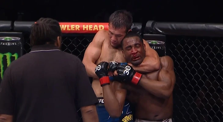 Казахстанец пропустил в бою 69 значимых ударов – 63 из них в голову. Это в два раза больше, чем во всех предыдущих боях UFC вместе взятых.