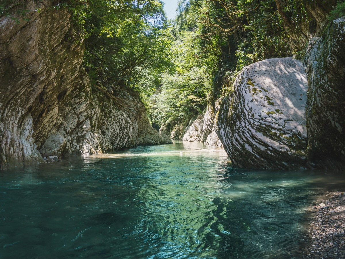 Главная река Сочи Хоста разрезает каньон Чёртовы ворота. По ущелью между 50-метровыми белесыми скалами петляет река. Вода в реке прозрачная и хорошо видно каменное дно. Многие купаются в Хосте, но вода прохладная даже в самые жаркие дни. Окрестности каньона утопают в зелени.