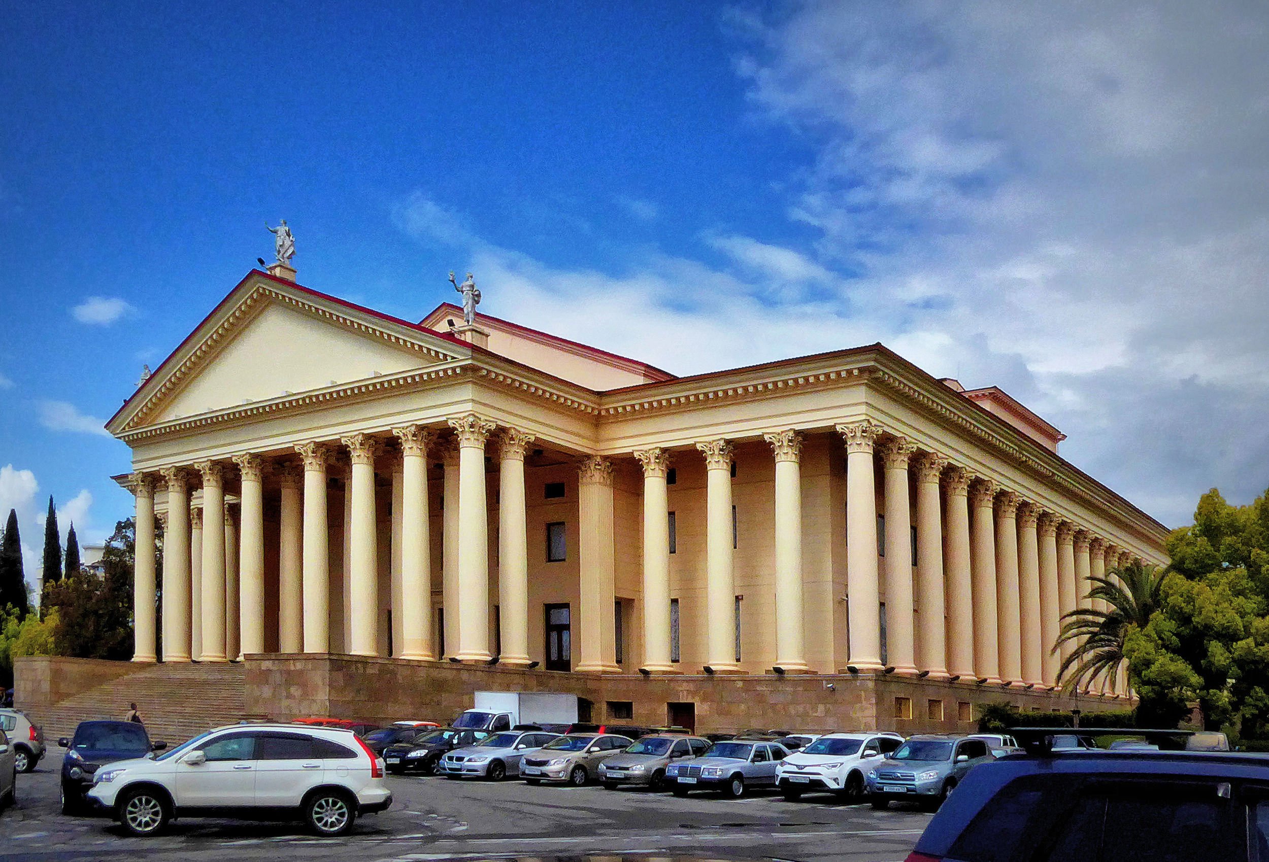 В 1937 году в Сочи появился Зимний театр. Здание украшает крыша красного цвета, которую поддерживают 88 колонн в коринфском стиле. Крышу театра украшают три женские фигуры, олицетворяющие живопись, архитектуру и скульптуру.