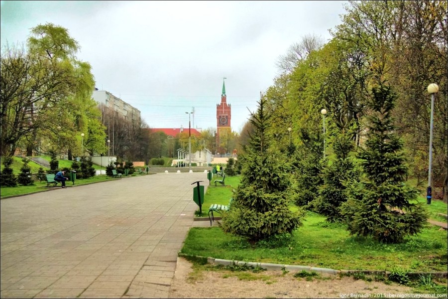 От пруда направляемся в парк аттракционов «Юность». Развлечения в нем включают колесо обозрения. Поднимаемся на самую верхнюю его точку и смотрим на Север, там есть улица Тельмана с красивыми старинным немецкими домами и современными особняками. Единственное, что портит тут вид, это заброшенные дома, с которыми власти города пока не придумали, что делать.