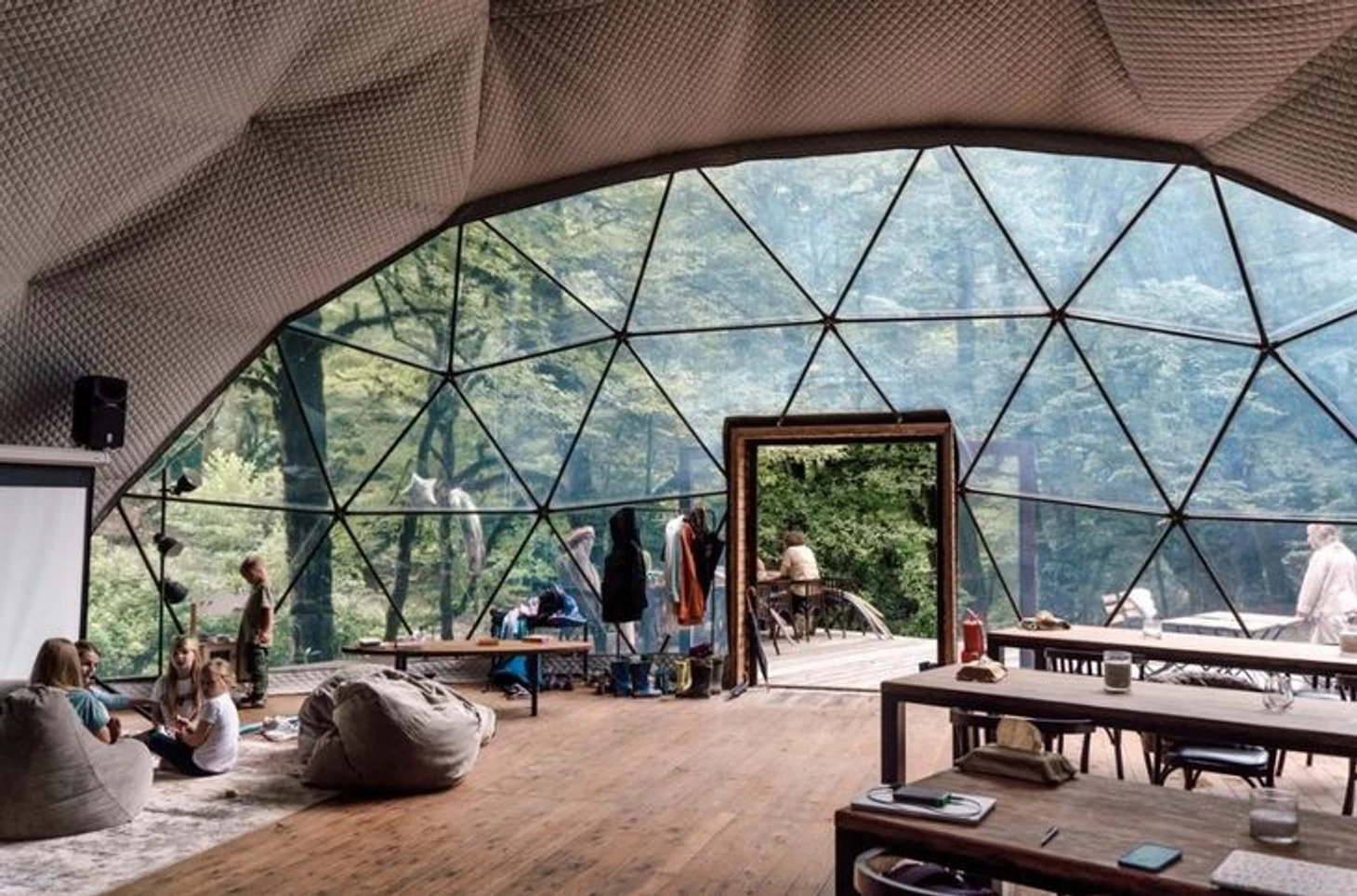 Кафе расположено в отдельном домике-сфере. Всего на территории «Вили Улей: Ока» двадцать таких домов. Предпочтительнее заезжать компанией из трех человек либо из четырех, например семья и двое детей. Можно с самыми маленькими, потому что внутри каждого домика можно установить детскую кроватку. Не возбраняется приезжать и с животными, нужно заранее об этом предупредить персонал отеля.