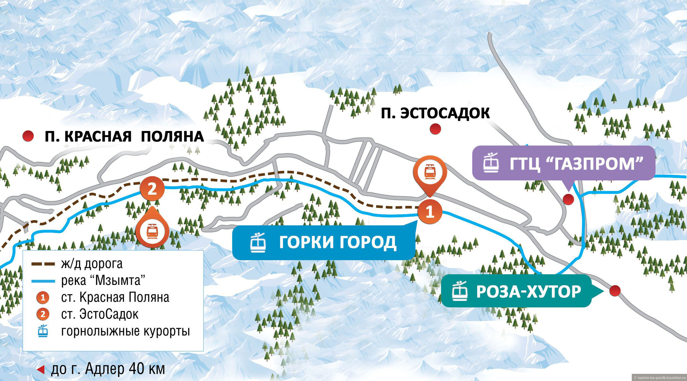 Но путаница может возникнуть еще и от того, что неподалеку от этих трех курортов находится поселок Красная Поляна, именно от него пошло название всего остального. Со временем все окружающие горы жители начали называть Красной Поляной. «Еду в Поляну» означает «еду в горы» и не важно в какую часть из них.
