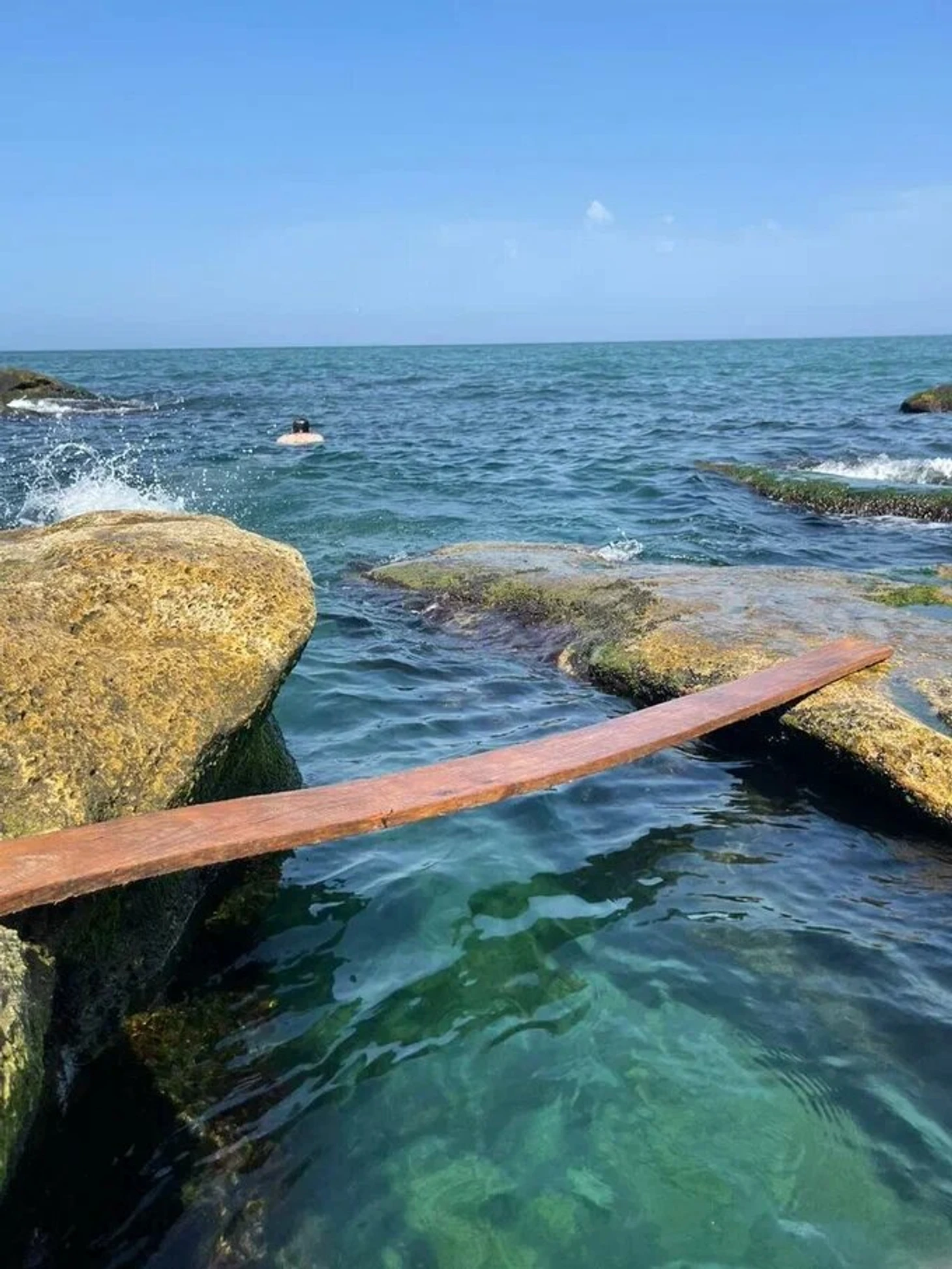 Инфраструктура этого пляжа немного лучше, чем Центрального. Здесь можно арендовать лежаки по цене от 150 рублей. Песок очень чистый. А вот качество воды практически такое же, как и на центральном, ведь понятно, что труба никуда не делась и запах разносится по пляжу.