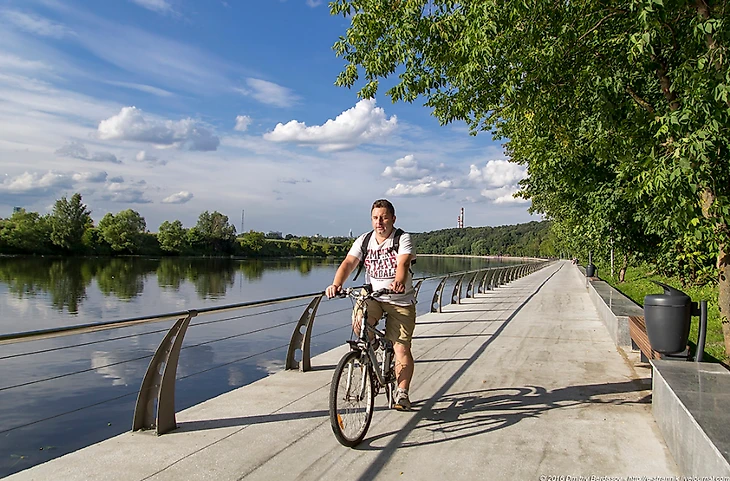 В самом парке несколько велодорожек, мы предлагаем начать движение в сторону Москвы-реки и выехать на крутой берег. Тут можно остановиться и посмотреть на красивую панораму Курьяново, Перервы и Марьино. Аккуратно на небольшой скорости спускайтесь по грунтовой дорожке к набережной и дальше отправляйтесь к шлюзу. Движение не интенсивное, поэтому можно смотреть по сторонам на памятники архитектуры.