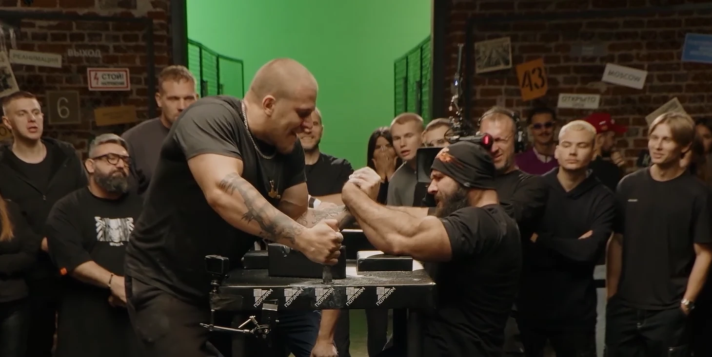 Не менее интересное противостояние, верх против крюка, получилось и в восьмой серии, где за столом сошлись Артем Гришин и Адам Баркинхоев. Хотя в этой серии не менее интересным получился и разогревочный армфайт между рекордсменом в строгом подъеме на бицепс Низами Тагиевым и армлифтером Никитой Юрковцом.