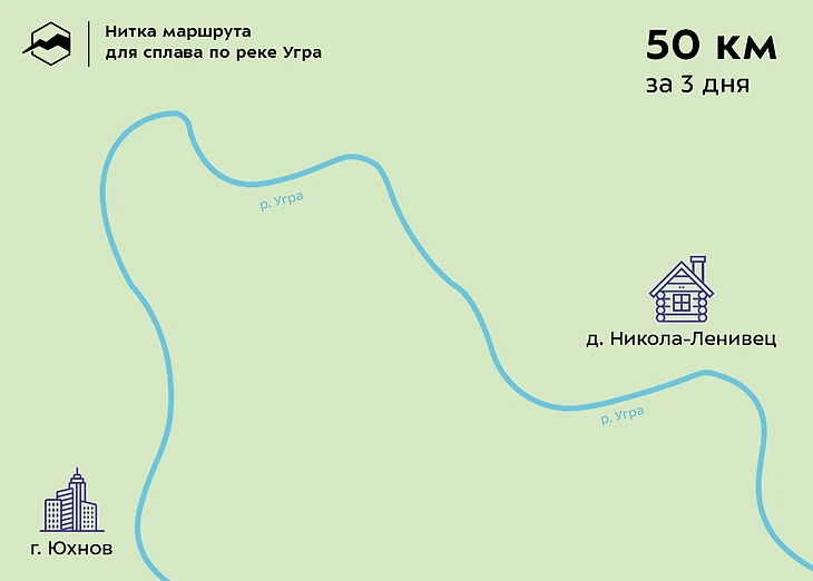 Река Угра находится в Калужской области. Начальная точка маршрута расположена в городе Юхнов, что в 190 километрах от МКАД. Лучше всего трансфер организовывать от Калуги. Своим ходом добираться сложно. Маршрут, протяженностью в 50 километров, соединяет город Юхнов и деревню Никола-Ленивец. Оптимальное время на сплав — три дня.