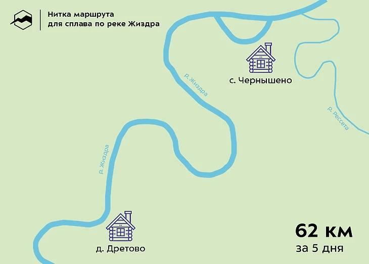 Река Жиздра находится в Калужской области. Начальная точка маршрута расположена в селе Чернышено, расстояние от МКАД 290 километров. Заказать заброску вы можете от Калуги, Козельска или Сухиничей. Маршрут протяженностью в 62 километра соединяет село Чернышено и деревню Дретово. Оптимальное время прохождения — 5 дней.