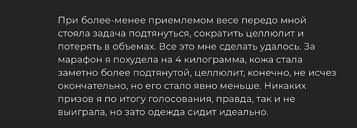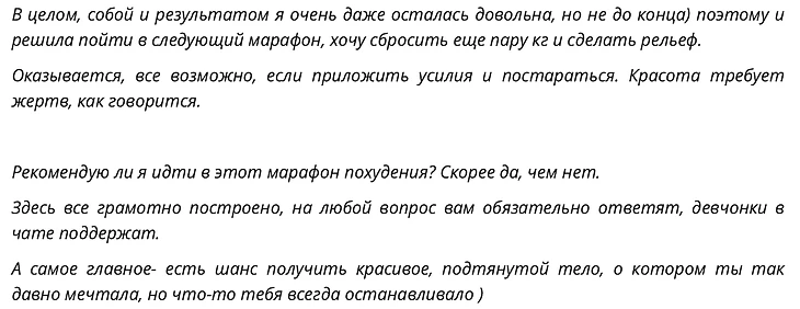 Во многих положительных отзывах говорят о том, что марафон помог начать правильно питаться и сделать регулярные нагрузки привычкой, что и помогло похудеть.